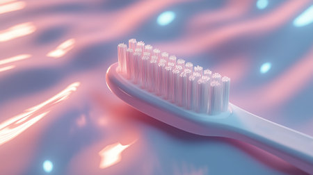 A close-up view of a toothbrush resting on a reflective surface with vibrant colors and gentle water ripples in the background
