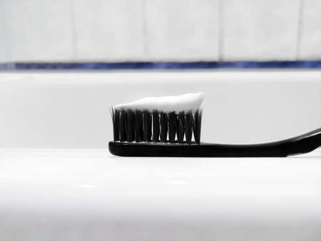 Close up of a black toothbrush with white toothpaste, symbolizing dental care and hygiene, perfect for health and beauty content
