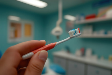 Close-up of a hand holding a toothbrush in front of a dental office.
