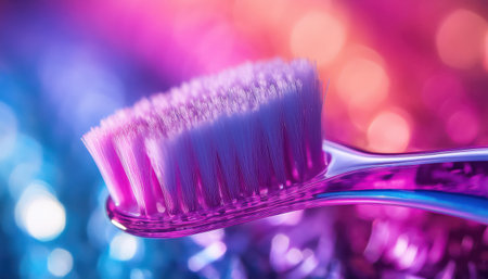 A colorful toothbrush stands out against a shimmering background, symbolizing dental hygiene.