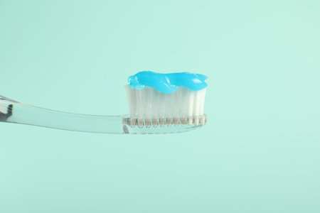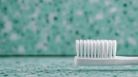 A close-up of a clean white toothbrush with soft bristles sits on a mint green counter. Background is blurred and solid. The atmosphere feels fresh, inviting, and hygienic.