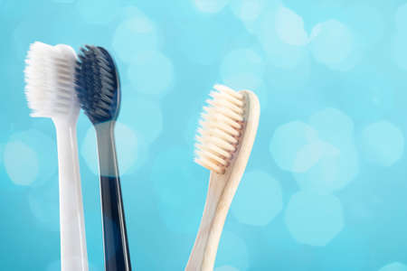 Ecological toothbrush from natural bamboo and two plastic toothbrushes in on a blue background. Sustainable lifestyle concept, zero waste.