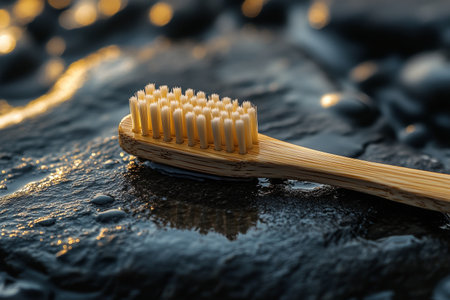 A bamboo toothbrush lies flat on smooth dark stones, showing its natural design and bristles. The scene highlights eco friendly choices for daily dental care in a calm environment.