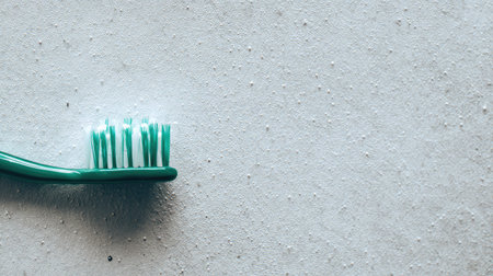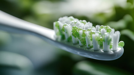 A close-up captures a green toothbrush with white and green bristles. The image showcases the brush's details against a textured white background. The composition suggests an indoor setting with even lighting. Suitable for dental hygiene, healthcare, or product promotion.