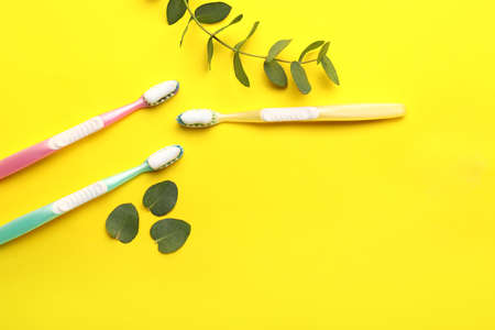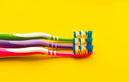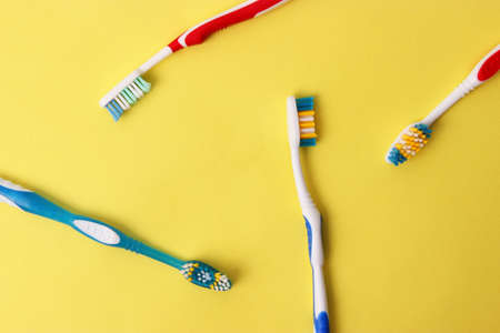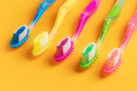 New colored plastic toothbrushes on a yellow background. Selective focus