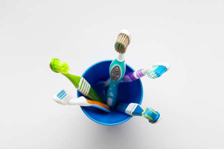 Toothbrushes in a plastic cup on a white background. Concept toothbrush selection. Oral cavity care. Dental hygiene. Space for text.