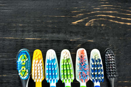 Multicolored toothbrushes on black background. Set of toothbrushes with copy space. Flat lay composition.
