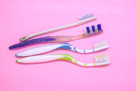 Several different used toothbrushes on a pink background. Toothbrush change concept, oral hygiene, big and friendly family, toothbrush selection. Flat lay, top view