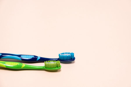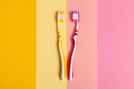 toothbrushes in two colors, yellow and pink. 2 color background. Copy space.