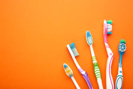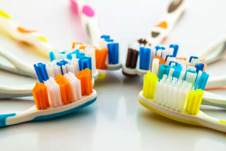 Clean teeth. Colorful plastic toothbrushes on white background top view.