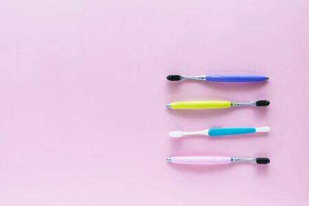 Fashionable toothbrush with soft bristles. Popular toothbrushes. Hygiene trends. Kit of toothbrushes on pink background.