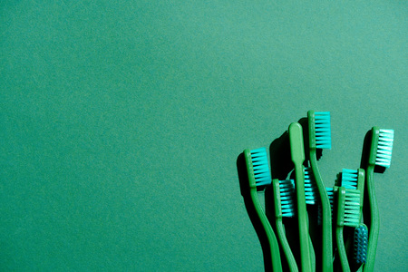 Oral care background. Many toothbrush. Zero waste pattern. Ecological wood brush. Dentist hygiene. Medicine home objects. Recycle dental concept. Repeat. Top view texture. Green color