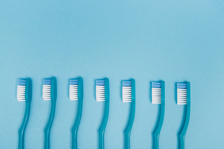 Close-up of red and green toothbrushes on blue background with copy space. Top view