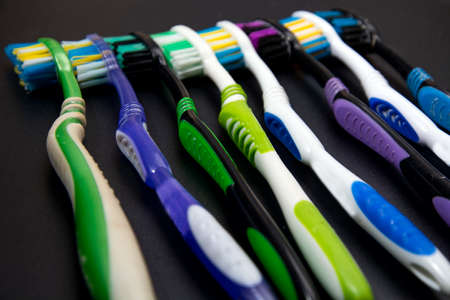Different colorful toothbrushes on black background. Oral hygiene concept.