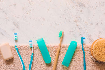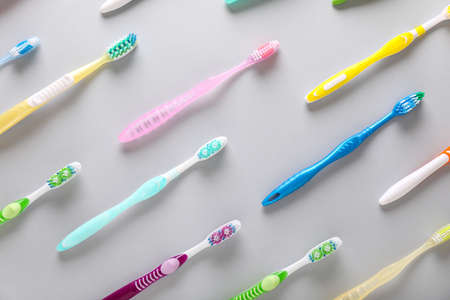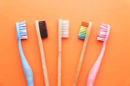 Set of ecology toothbrush on grey background. Different color. Diversity concept. Sustainable mouth product. Zero waste lifestyle. Organic accessory group. Dental health at home. Biodegradable recycle