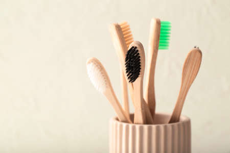 Colorful bamboo toothbrushes in cup. Organic wooden brushes. Zero waste, plastic free, eco friendly organic product concept. Close up.