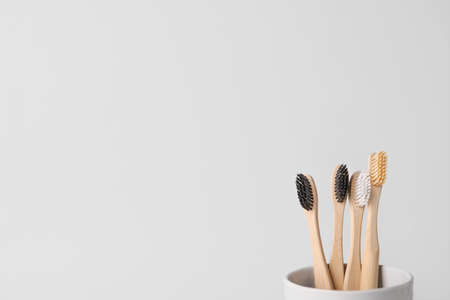 Colorful bamboo toothbrushes in cup. Organic wooden brushes. Zero waste, plastic free, eco friendly organic product concept.