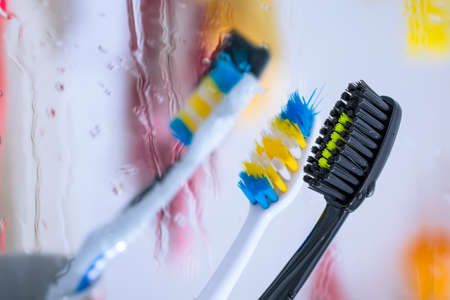 Black toothbrush in the bathroom for cleaning teeth and personal hygiene on the background of a wet mirror