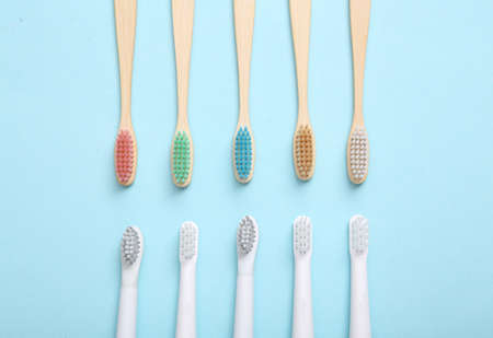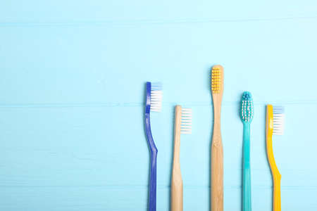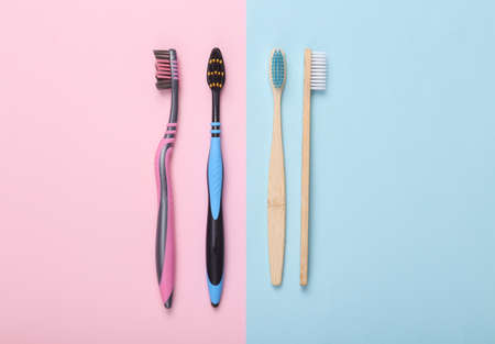 Plastic and wooden toothbrushes on a blue-pink pastel background. top view