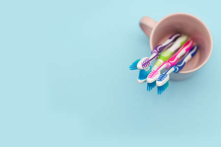 Close-up photo of four multi-colored toothbrushes in a cup holder against a blue background with copy space, top view. The concept of healthy teeth in the family