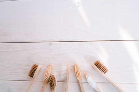 Zero waste bamboo toothbrush on eco wooden white background . High quality photo