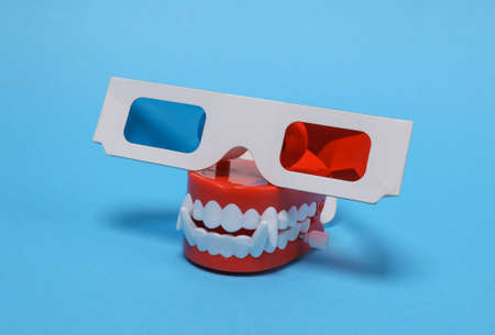 Halloween entertainment concept. Vampire clockwork jaw with 3d glasses on a blue background