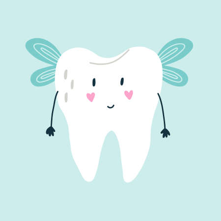 Tooth Fairy. Vector illustration. Tooth fairy in the form of a tooth. Tooth character in kawaii style. Flat cartoon style.