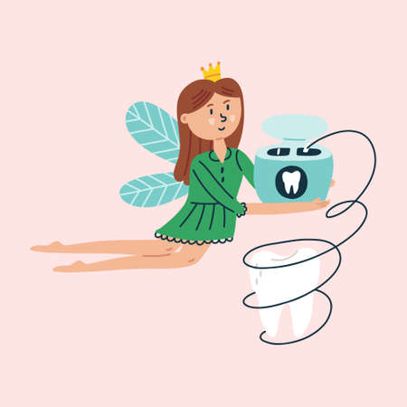 Flying Tooth Fairy with Flossing. Magic Fantasy Character Design in isolated clipart in doodle, cartoon, flat style on pink background