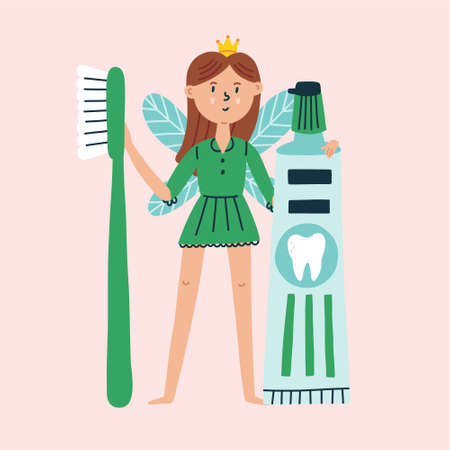 Tooth Fairy with toothbrush and toothpaste. Magic Fantasy Character Design in isolated clipart in doodle, cartoon, flat style on pink background