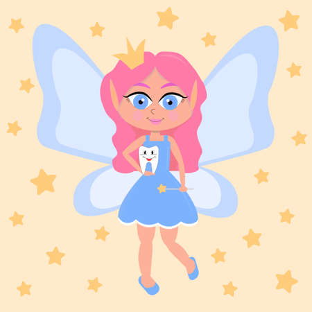 Vector character in a flat style. Tooth in the form tooth fairy with wings. In the crown and in the hand is a magic wand with a star.