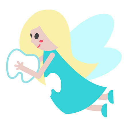 Funny cartoon Tooth Fairy. Cute girl with fair hair and wings. Fairy in blue dress with tooth print. Illustration for kids and children. Print for books, banner, invitation, sticker, design and decor.