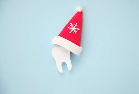 Dentistry banner background for Christmas and New Years with tooth model on blue background with Christmas decor with copy space.