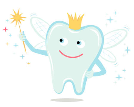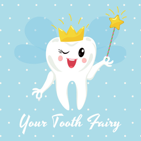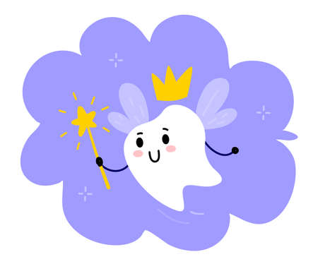 Cute happy tooth fairy character wearing a crown with a magic wand. Dental character for childrens dentistry. National Tooth Fairy Day card.