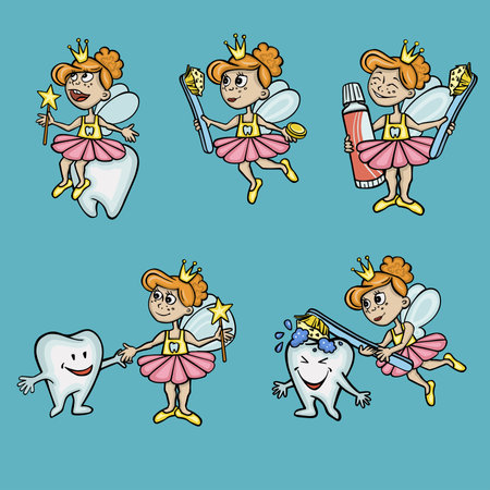 Tooth fairy. Cute little flying princess with wings in action poses exact cartoon fantasy mascot isolated