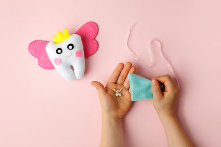 Tooth Fairy with paper figure on pink background