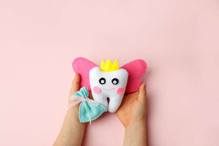 Little child holding felt tooth fairy toy in his hands on pink background. Easy and funny kids crafts, DIY, Happy Tooth Fairy greeting card, flyer, copy space, concept of tooth changes