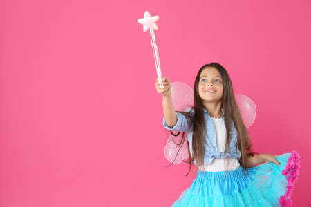 Cute little girl in fairy costume with wings and magic wand on pink background. Space for text