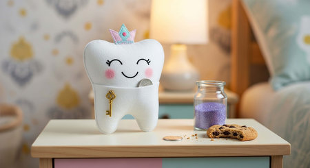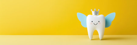 Playful tooth with wings and crown on yellow background, symbolizing Tooth Fairy, brings fun approach to dental care for children while promoting healthy habits.