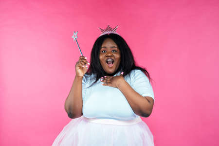 Beautiful girl in fairy costume with wings and magic wand on pink background