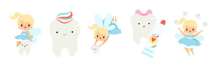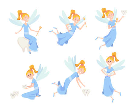 Tooth Fairy Blond Little Girl In Blue Dress with Wings And Baby Teeth Vector Set