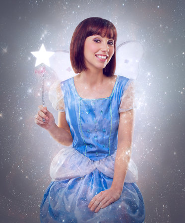 Little fairy princess looking up and holding small plastic magic wand