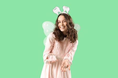 Tooth Fairy with wallet and coin on green background