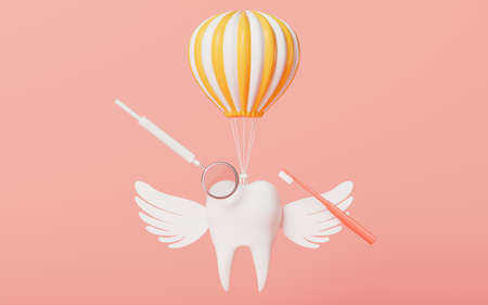 A dental mirror and cartoon angel tooth, 3d rendering. Computer digital drawing.