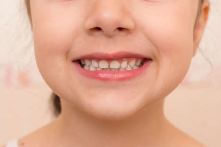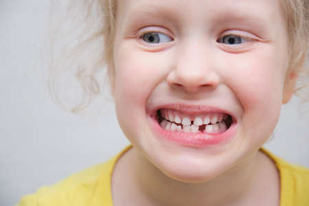 Selective Focus Child's teeth. An 8 year old little girl lost a baby incisor. Children's dentistry and oral hygiene concept. Macro shoot