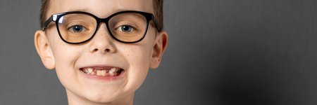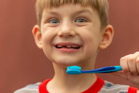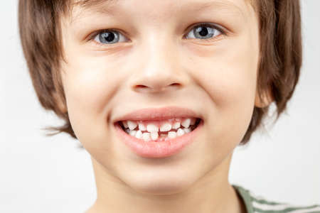 A boy of 6-7 years old shows the first teeth that grow after the loss of milk teeth. Close-up portrait