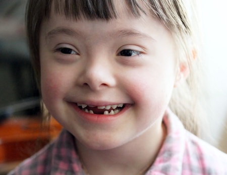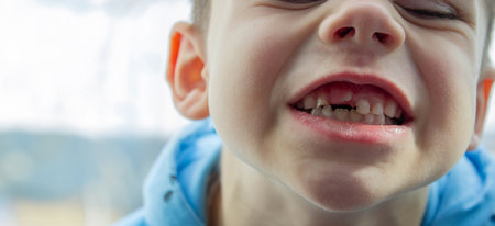 close-up mouth of a five-year-old Caucasian girl with a stagger baby tooth, front tooth tilted forward on the lip