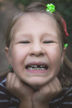 Portrait of toothless child girl missing milk and permanent teeth. Closeup of young kid with teeth gaps and growing permanent teeth and healthy gums posing outdoors in nature.