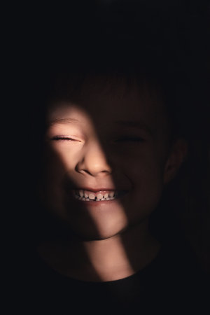 boy 3-7 on a dark background smiles with all his teeth. a streak of light illuminates his face. Eyes closed