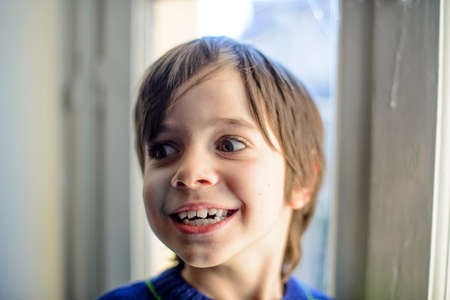Portrait of Adorable Young Boy Smiling on Camera. In the Background Blurred Sunny Room.