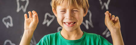 Litle caucasian boy holds a dropped milk tooth between his fingers and laughs looking into the camera BANNER, LONG FORMAT